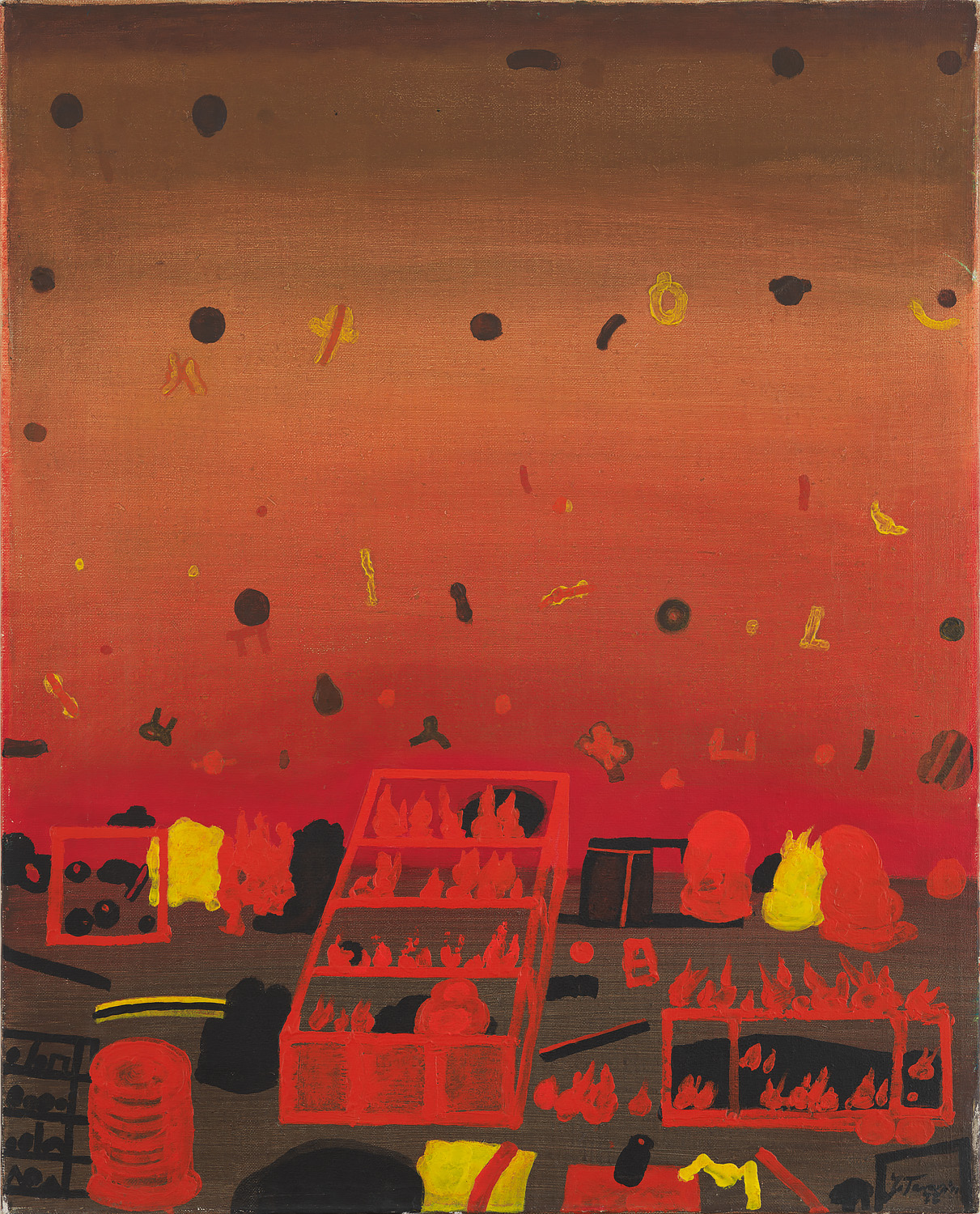 Jan Tarasin, Pożar, 1976 rok, olej na płótnie, rozmiar 81 cm na 65,5 cm, sygnowany prawy dół i na odwrociu. PRACA NIEDOSTĘPNA.